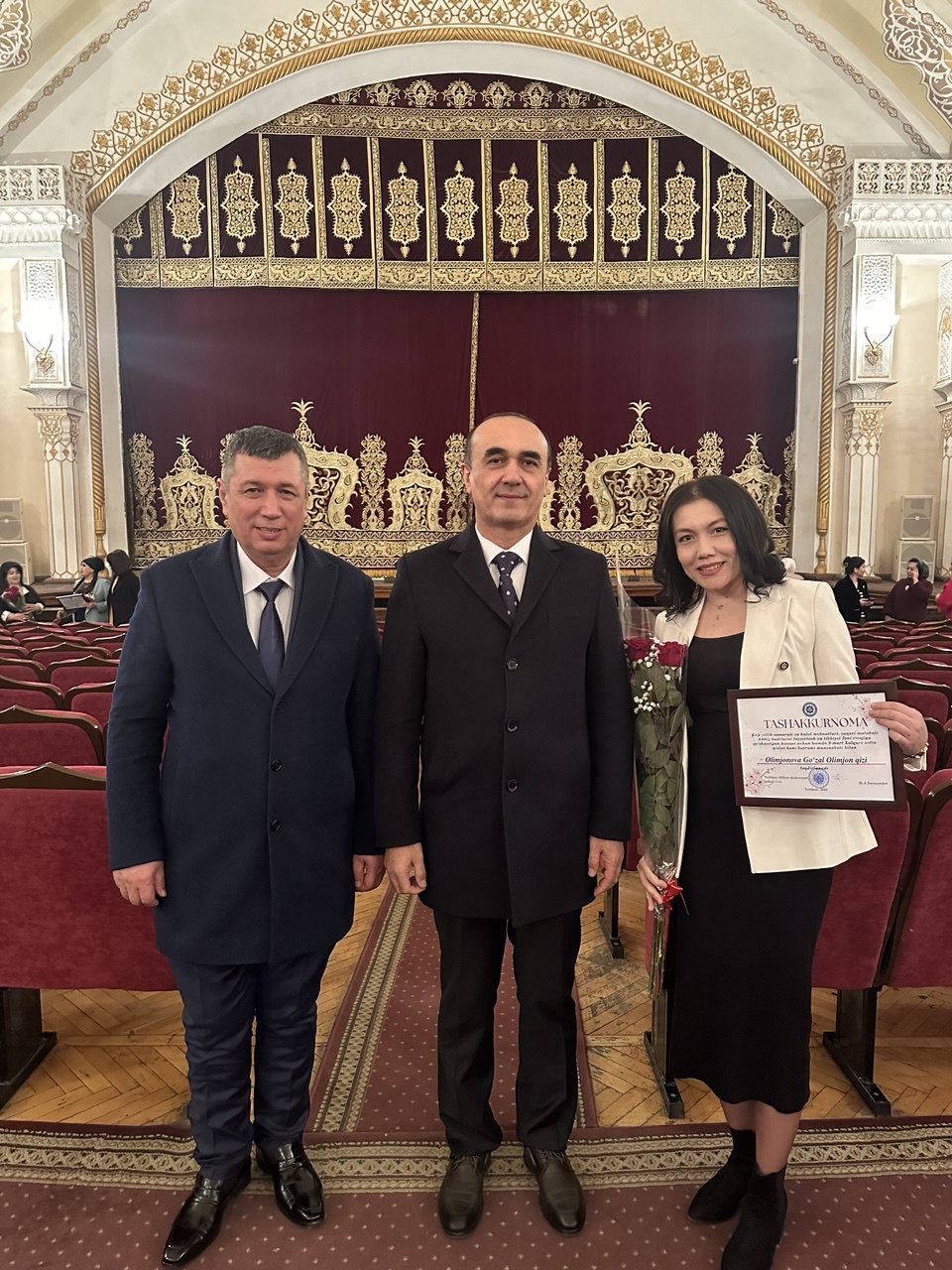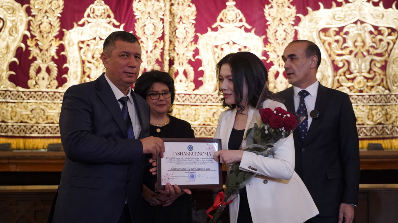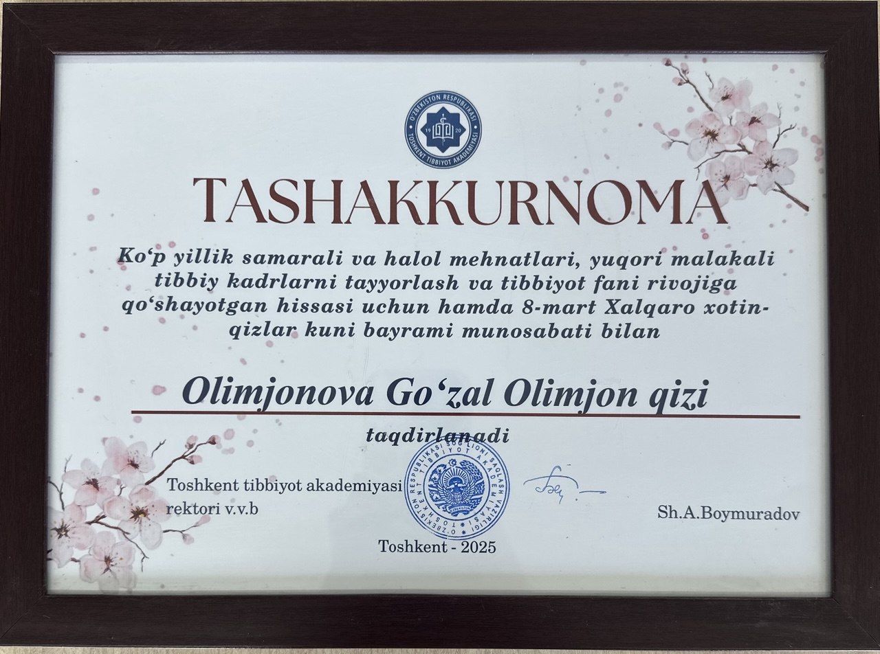 В связи с 8 марта 2025 года – Международным женским днём – на торжественном мероприятии были награждены активные и инициативные сотрудницы нашего университета. Среди них — сотрудница кафедры «Гистология и медицинская биология» Олимжонова Гузаль Олимжон кизи.